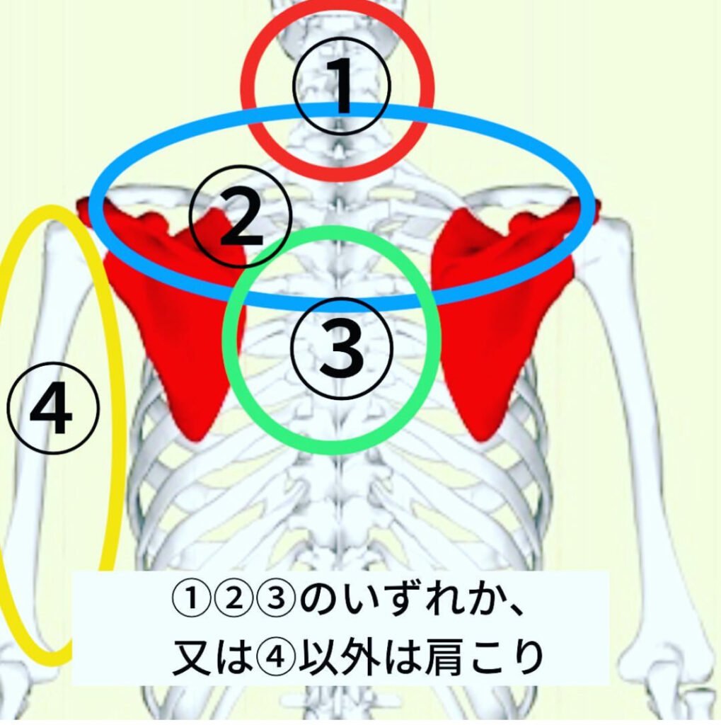 まず、①から③のいずれか、または④以外のすべて。これは肩こりに該当します。
